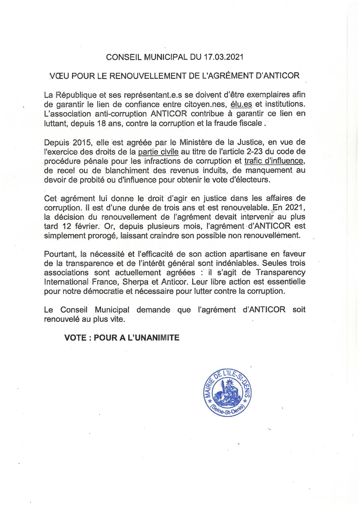 Ces conseils municipaux ont voté une motion pour demander le renouvellement de l’agrément d’Anticor :