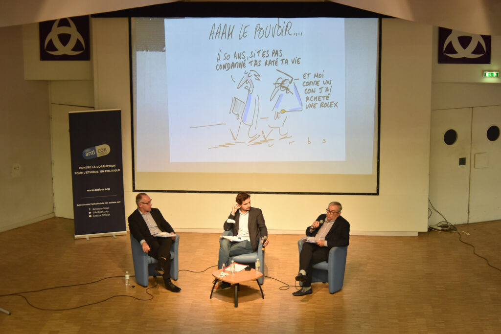 L’après-midi, ouverte au public, était dédiée aux tables rondes. Anticor a exploré les conditions d’une résistance à la corruption et aux abus de pouvoir, au travers de deux tables rondes, illustrées en direct par le dessinateur de presse Rodolphe Urbs.