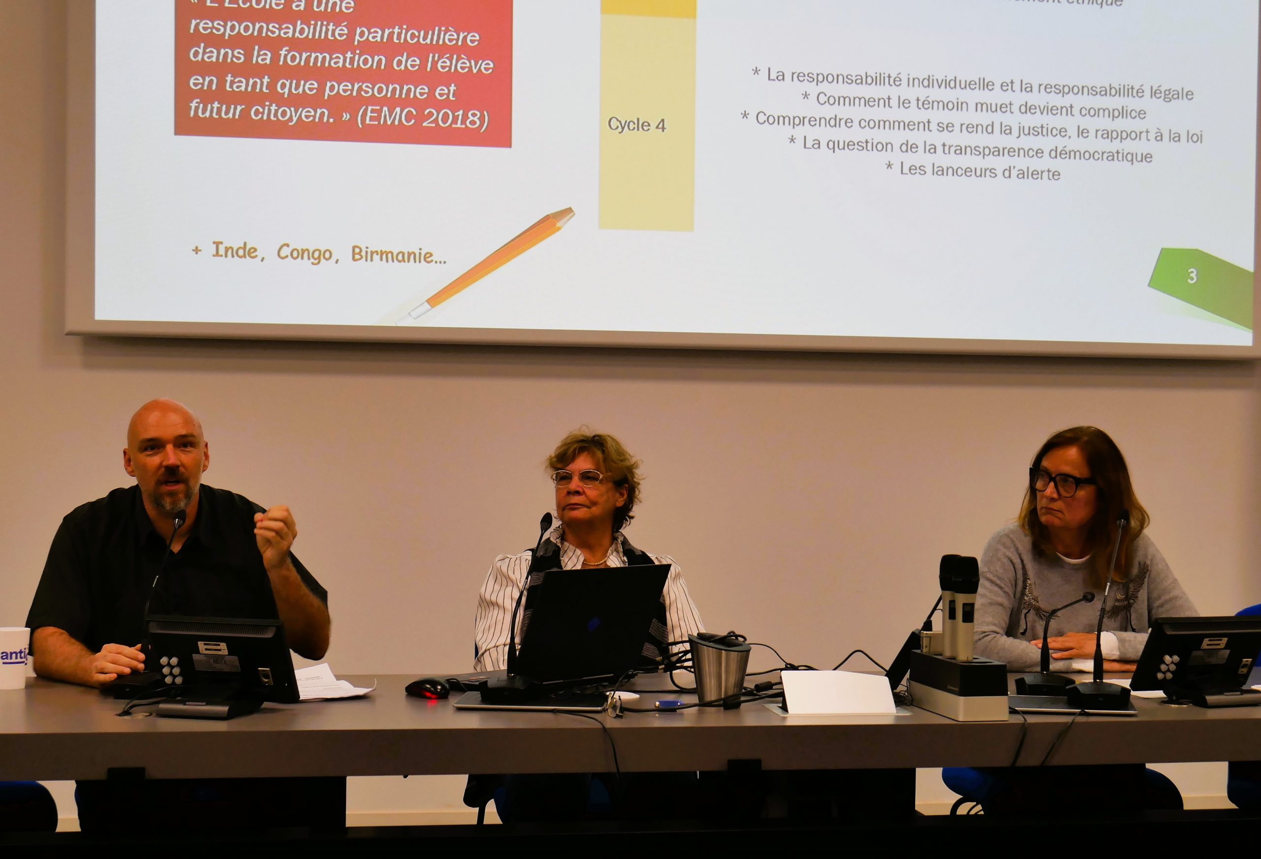 La dernière table ronde s’intéressait cette fois à « la corruption et l’éducation », animée par Danielle PELLIER (administratrice d’Anticor), Marie BRANNENS (co-référent d’Anticor 92) et Frédéric GRIMAUD (adhérent Anticor).