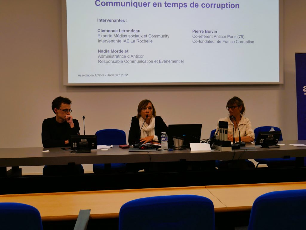 La deuxième table ronde, intitulée « Communiquer en temps de corruption », a réuni Nadia MORDELET (responsable communication d’Anticor), Clémence LERONDEAU (experte Médias sociaux et Community et intervenante IAE La Rochelle) et Pierre BOIVIN (co-référent d’Anticor 75 et fondateur de France Corruption).