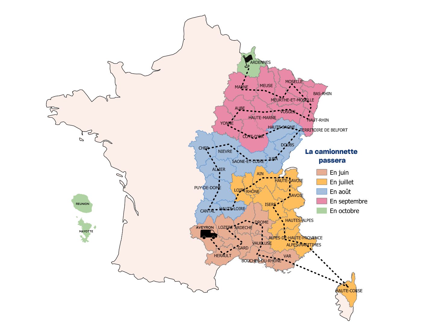 Départ de l’Aveyron début juin, arrivée dans les Ardennes début octobre, avec un détour par l’outre-mer grâce à des événements en visioconférence. En moyenne, deux jours dans chaque département, avec au moins deux actions organisées à chaque étape.